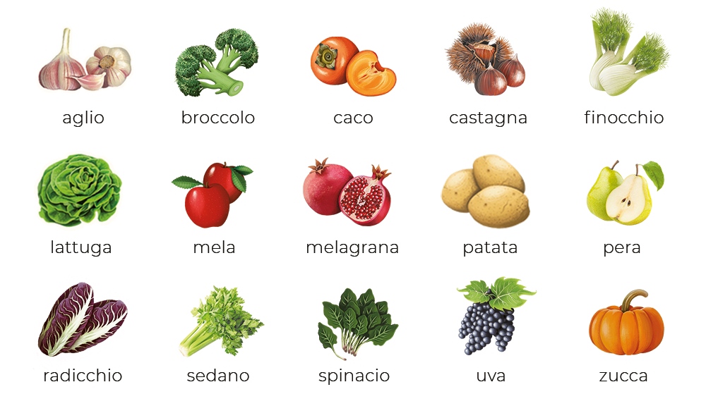 La zucca, i funghi, le castagne, i fichi, i cachi, mele e pere, il melograno, il radicchio, l’uva e i kiwi