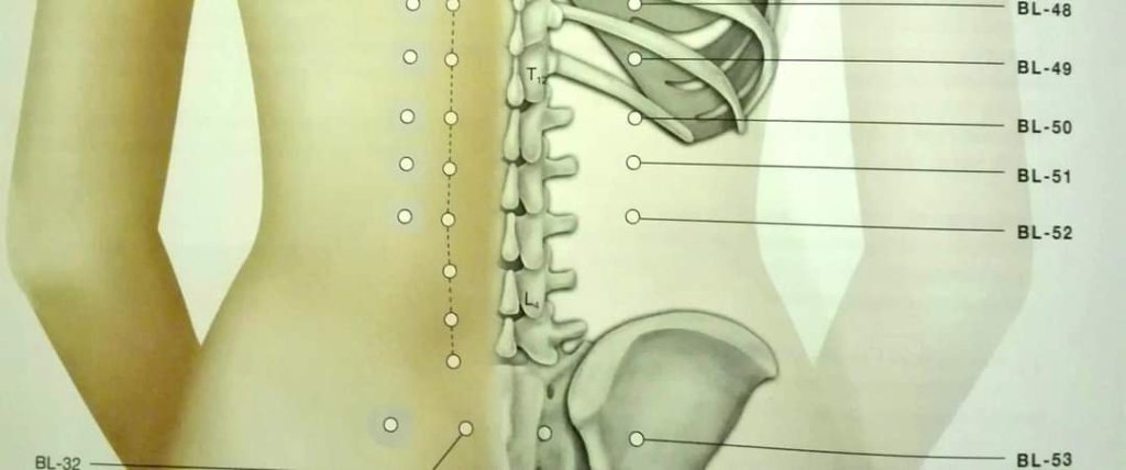 BL 52 situato a tre pollici laterale sotto la seconda vertebra lombare. Per trovare la 2a vertebra lombare all’ incirca all’ altezza dell’ ombelico dove la cintura si fa più stretta. Questo punto rinforza anche la regione lombare e regola la minzione.
