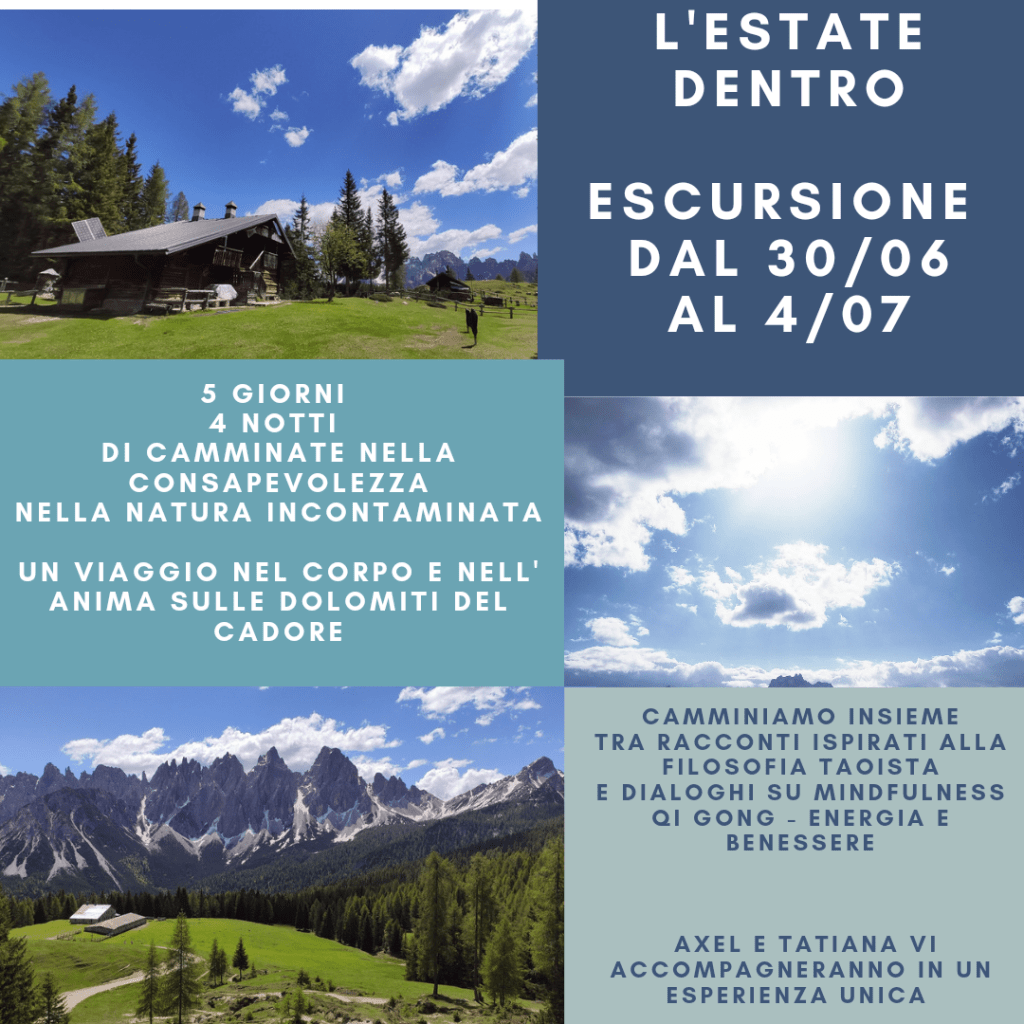 Io e il mio amico Axel, esperta guida escursionistica, abbiamo pensato di programmare cinque giorni di bellezza e benessere nella splendida cornice delle Dolomiti del Cadore, fra le suggestive guglie degli Spalti di Toro. Qui uniremo attività legate al movimento, come le escursioni a piedi, ad attività rivolte al nostro mondo interiore. Faremo infatti esperienza di meditazione, consapevolezza e Mindfulness, praticheremo le attivazioni energetiche, attraverso la respirazione e i movimenti del Qi Gong, e faremo delle camminate consapevoli.